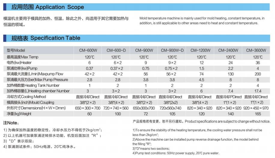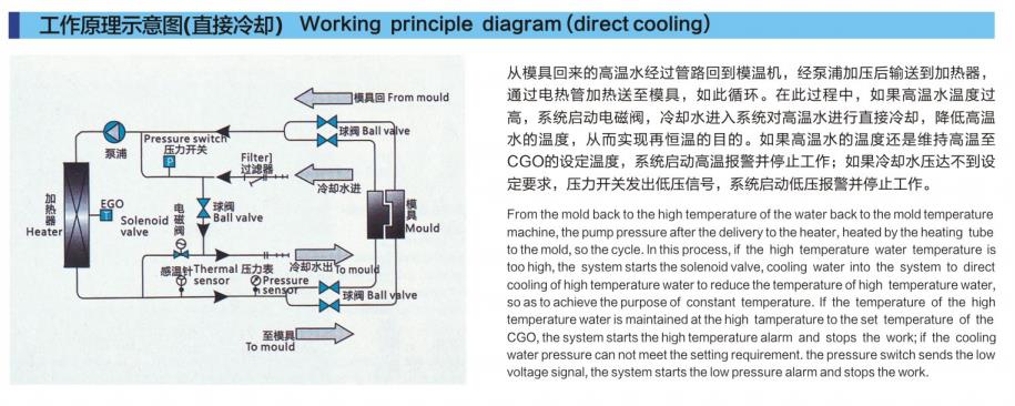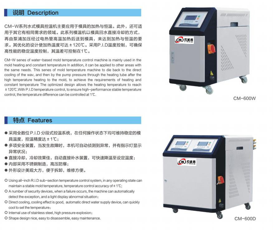 CM-W系列水式模具控溫機(jī)主要應(yīng)用于模具的加熱與恒溫。此外,還可適用于其它有相同需求的領(lǐng)域。此系列模溫機(jī)以模具回水直接冷卻的方式,再由泵浦加壓經(jīng)過電熱管高溫加熱后送到模具,來達(dá)到加熱與恒溫的要求。其優(yōu)化的設(shè)計(jì)使加熱溫度可達(dá)±120℃。采用P.I.D溫度控制,可確保高性能的穩(wěn)定溫度控制,其溫差可控制在1℃。